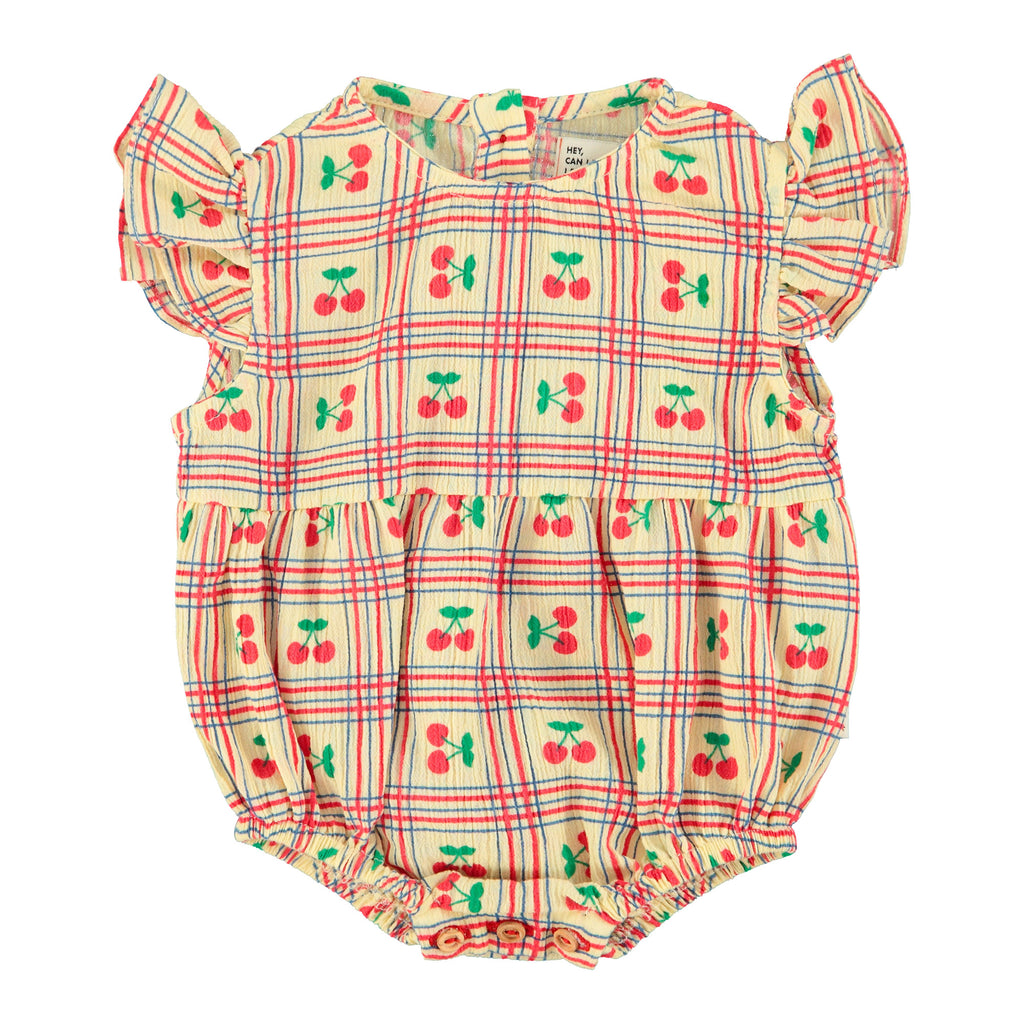 Sleeveless Baby Romper With Round Neckline And Ruffles On Shoulders. Elastic At Thighs. Buttons Between Legs. Wood Buttons In The Back.