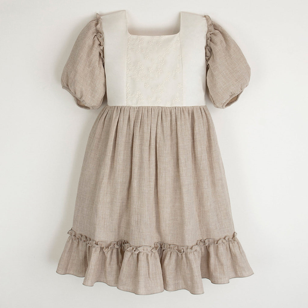 Popelin Sand Plaid Dress With Puffed Sleeve