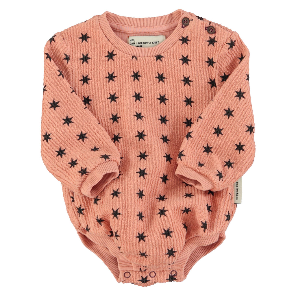 Baby long sleeve romper with round ribbed neckline. Buttons on shoulder. Elasticated cuffs. Elastic ribbed at thighs. Fasteners between legs.